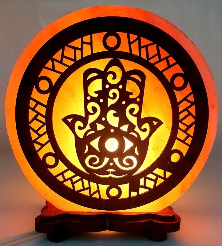 Lampada di sale himalayano decorata con Mano di Fatima e occhio di Allah. Questa lampada è l’espressione della presenza di Dio, che vede, benedice e protegge.