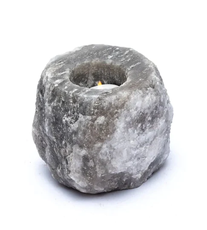 Portacandele in cristallo di sale himalayano grigio grezzo.
